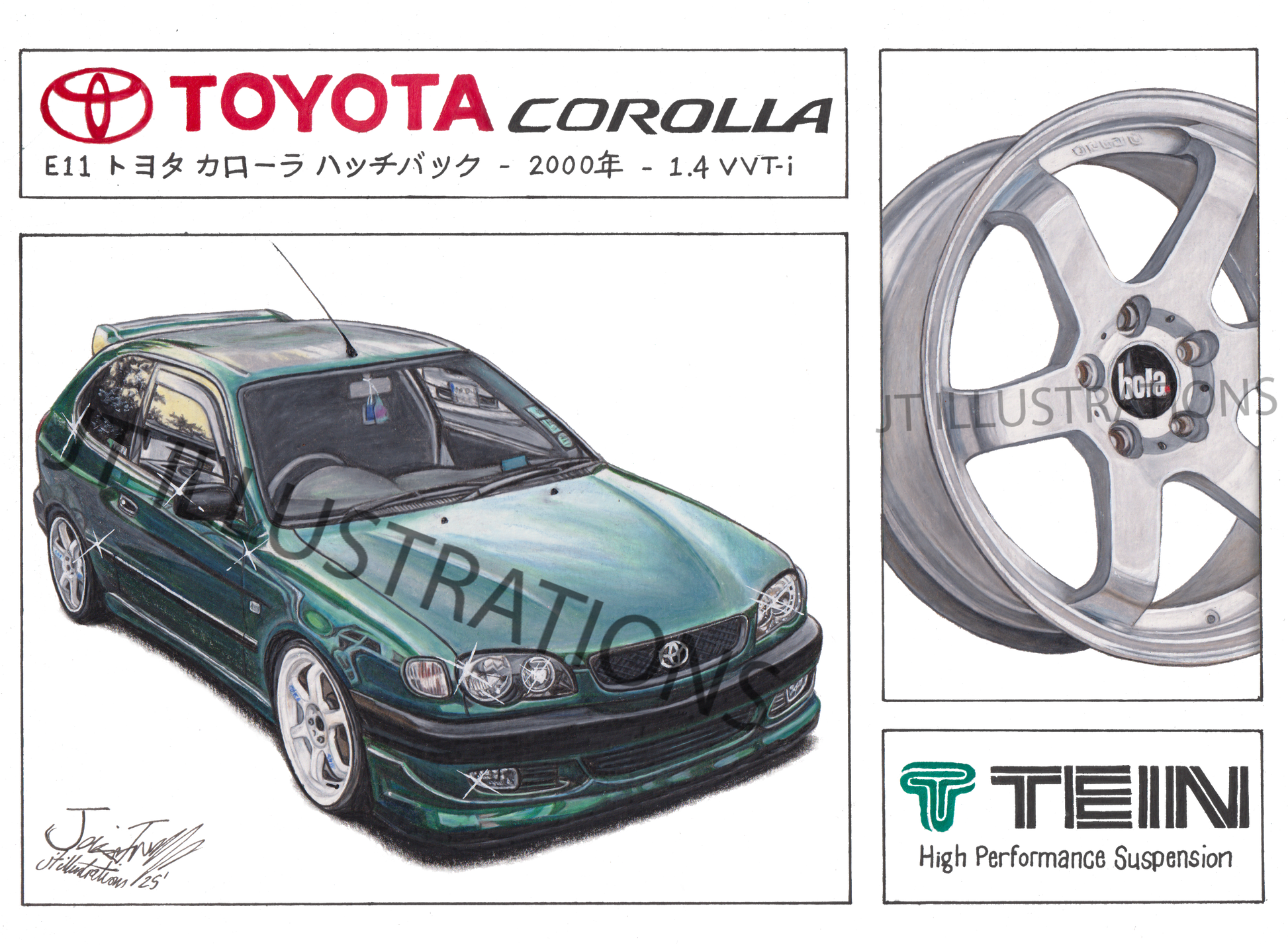 This unique E11 Corolla poster is available in a beautiful high resolution print on super glossy photo paper. This print is of exceptional quality, and is printed directly from my original drawing that captures every detail of the car and hand drawn lettering. Perfect for any old school enjoyers.